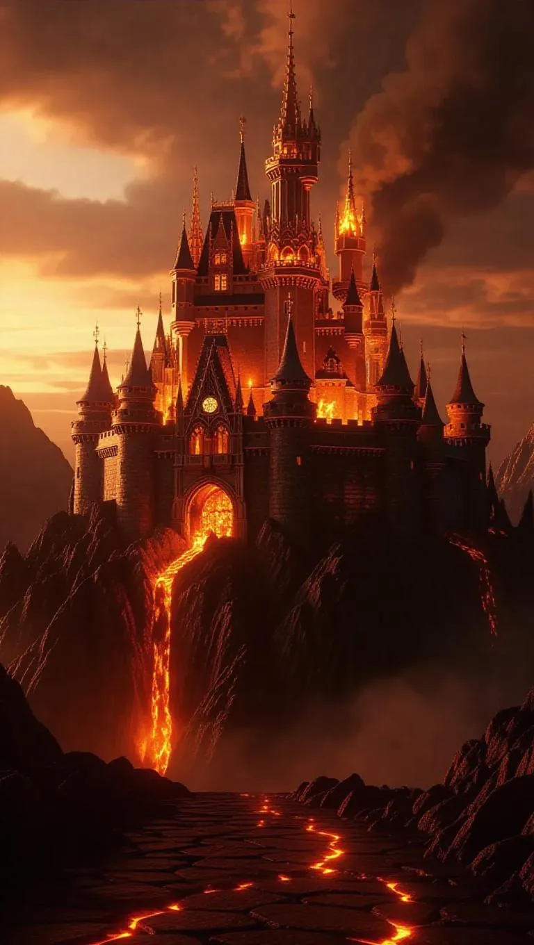 A splendid castle made of living fire, its walls ignited and radiant, hovering above a landscape of charred stones, epic fantasy, high detail, ultra-HD