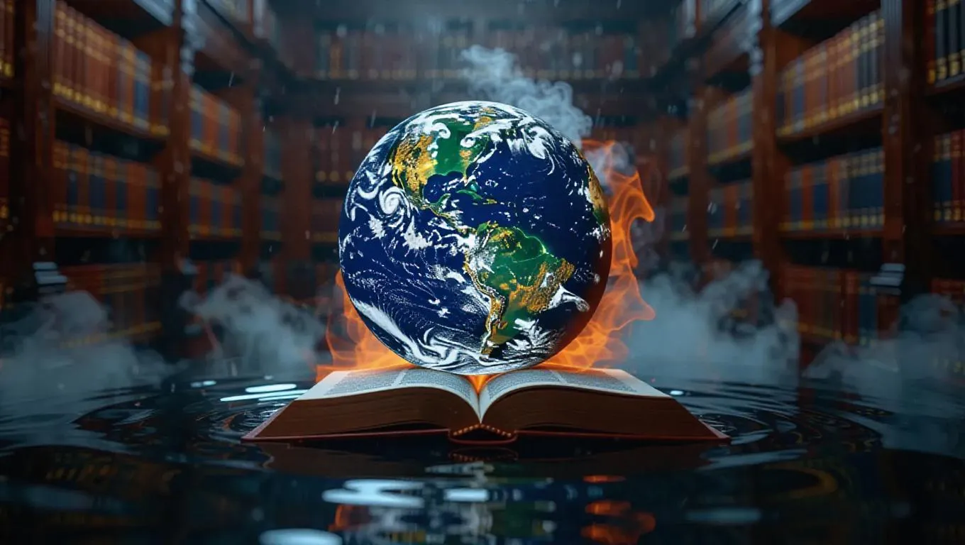 A library globe spinning leisurely as continents flame up, oceans swirling into steam that rains down as ash. Apocalyptic allegory, tilt-shift lens distortion, set against a backdrop of a submerged library and drifting tomes.