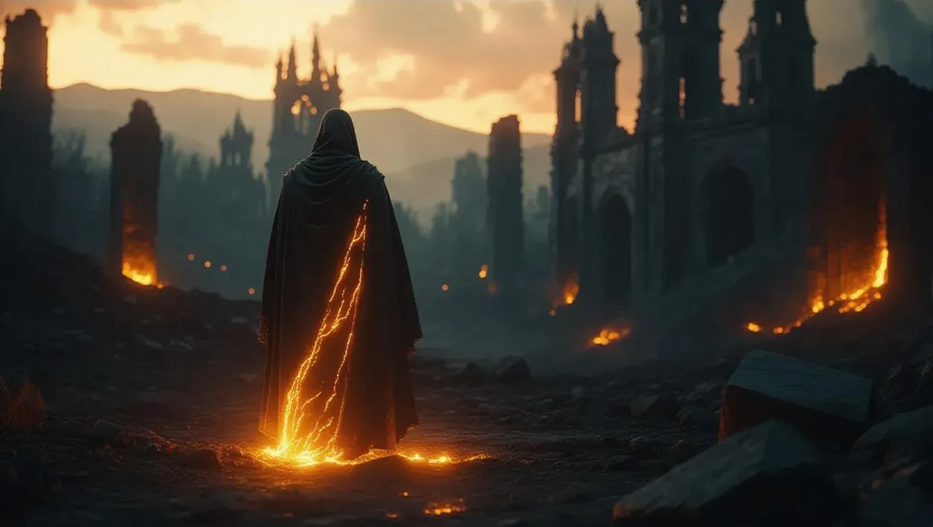 An isolated traveler amidst incandescent ruins, his torn robe glowing softly with ash, post-apocalyptic landscape, serene lighting, magical fire display