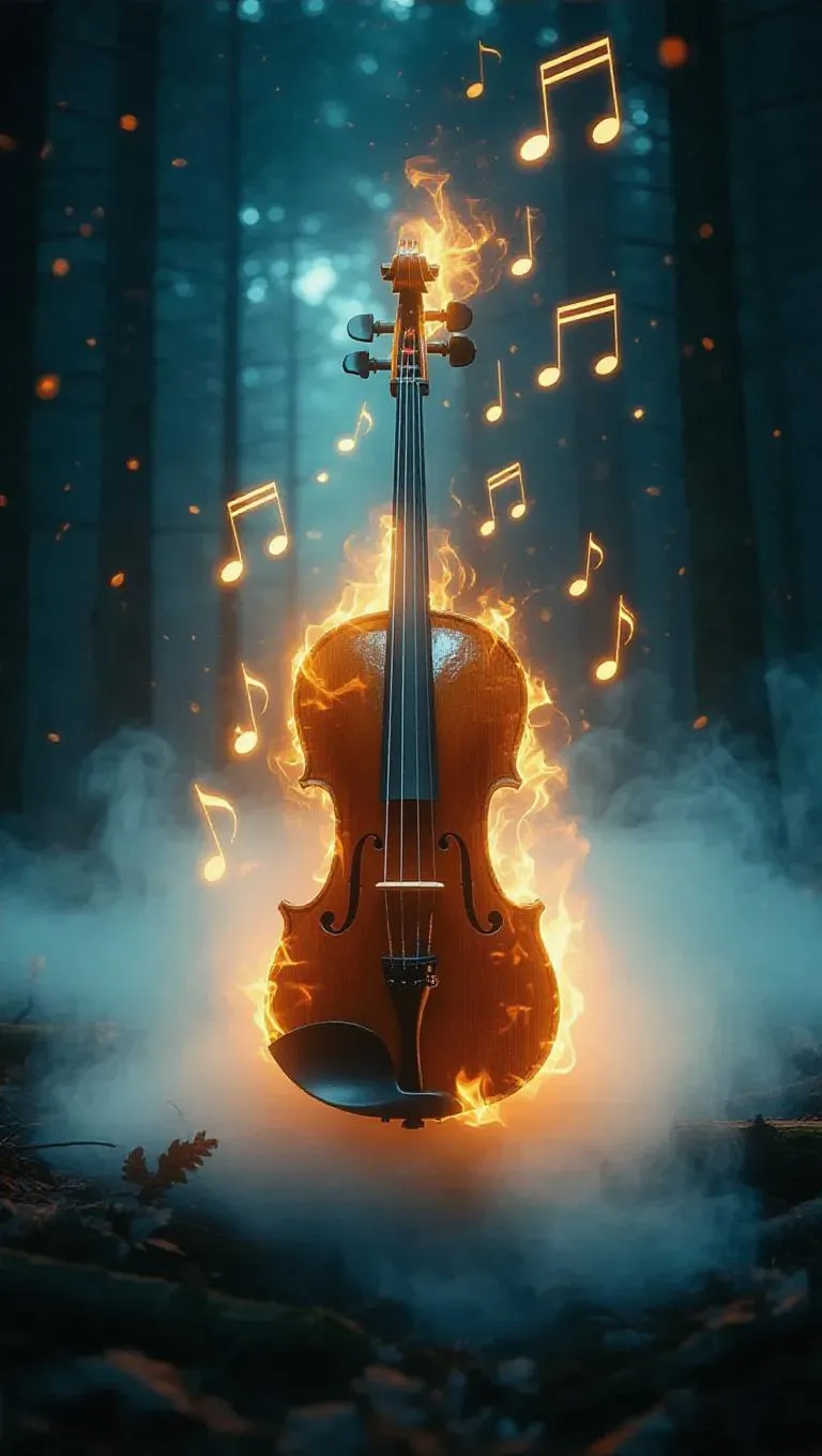 A burning violin playing itself in a misty forest, musical notes forming glowing trails, magical realism, dramatic composition, ultra-detailed.