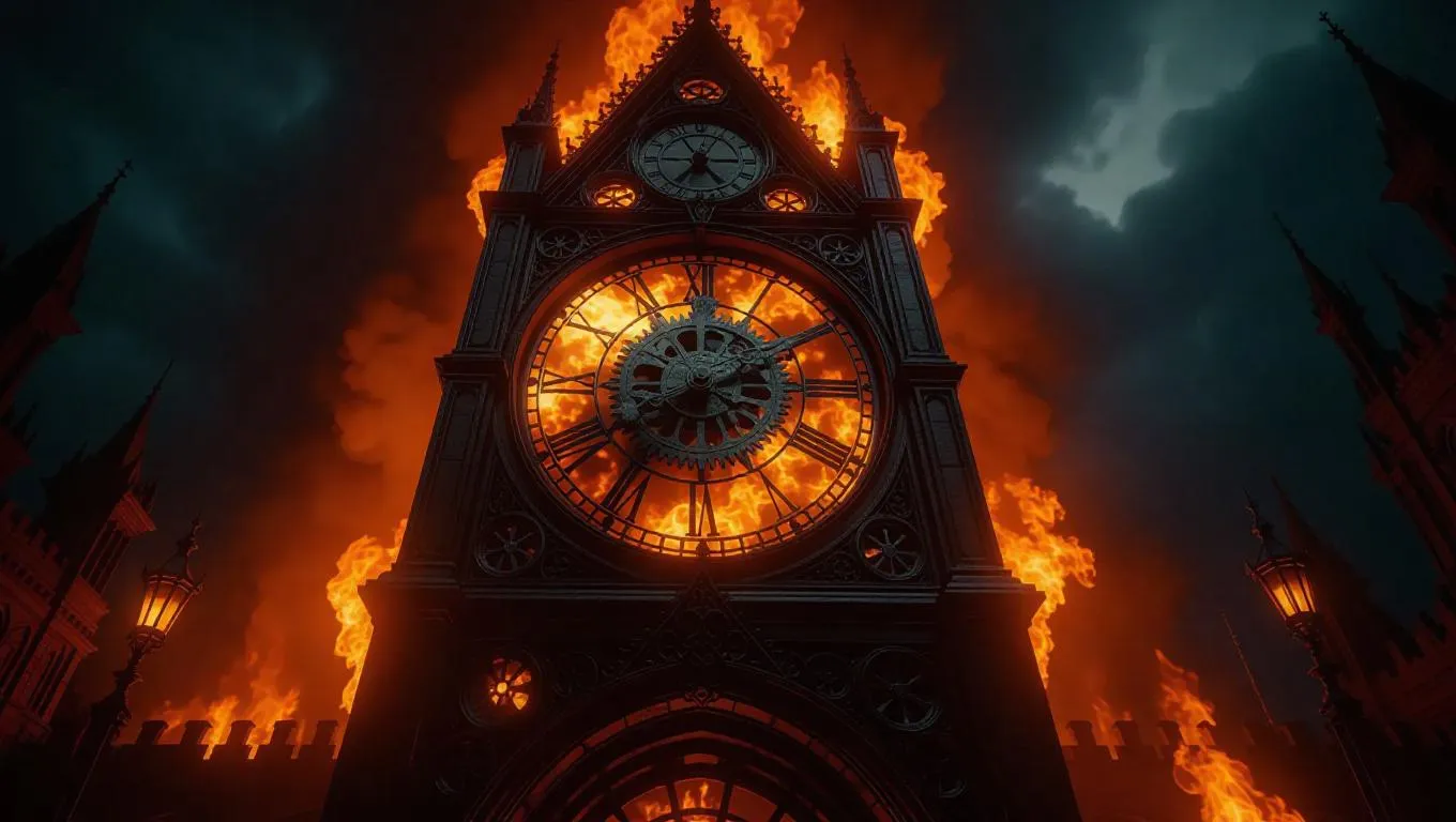 A colossal ancient clock tower consumed by roaring fire, gears and cogs melting, steampunk aesthetics, dramatic lighting, ultra-detailed.