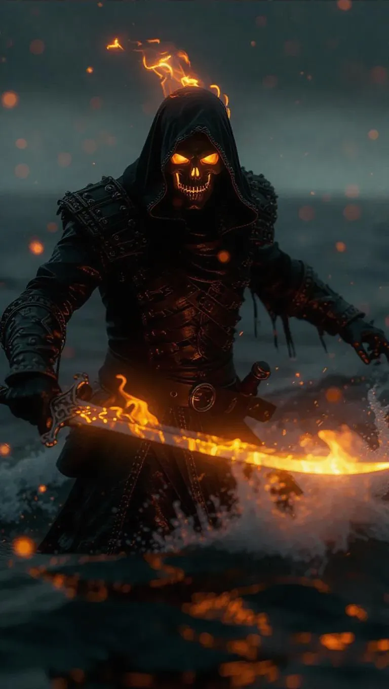 A ghostly corsair with a luminous skull of flames, his ragged attire glowing with embers, wielding a blazing cutlass, shadowy flames enveloping the turbulent ocean, striking aesthetic