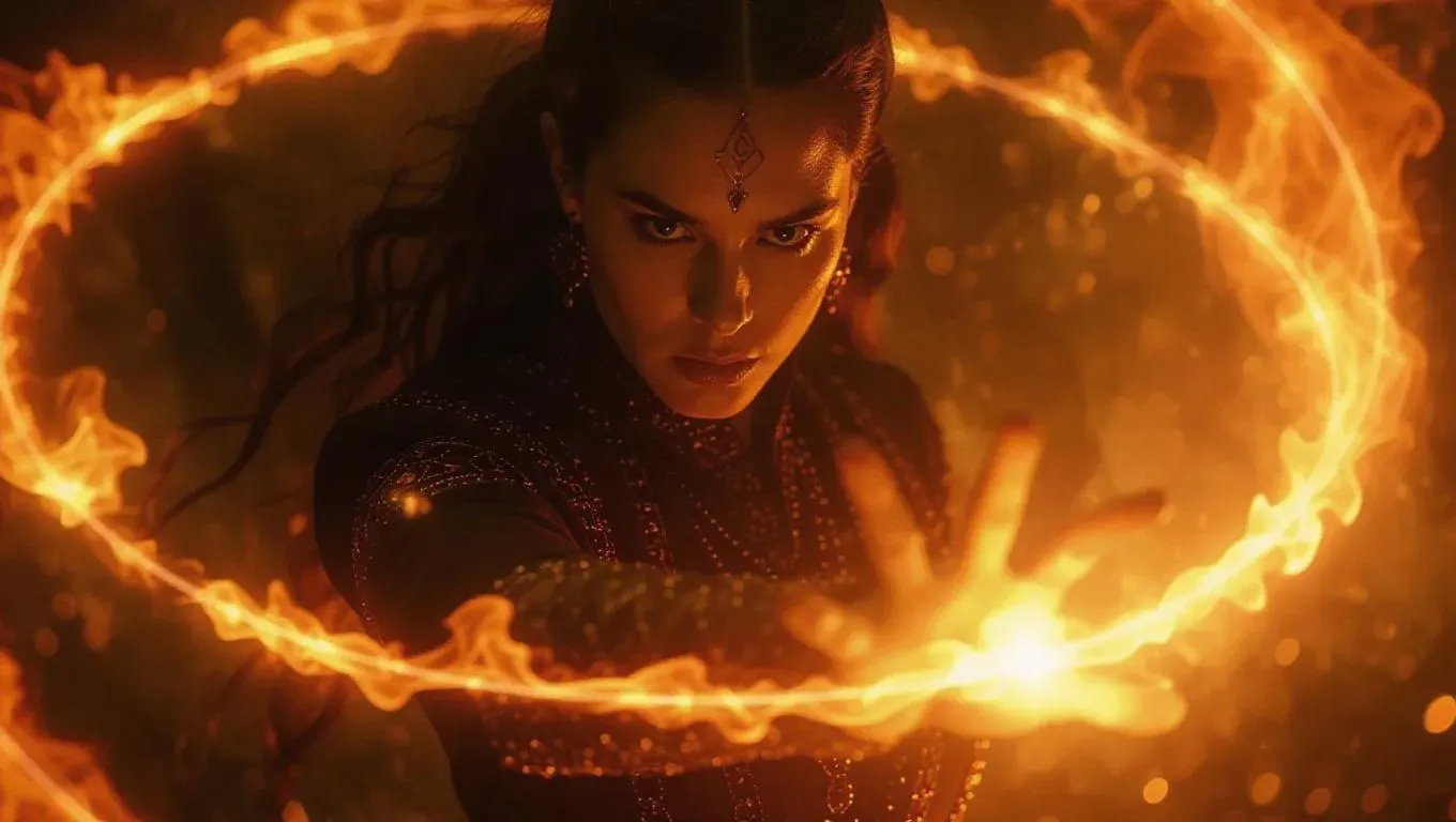 A fierce sorceress summoning fire magic, swirling flames forming protective runes around her, intense lighting, dark fantasy, ultra-HD.