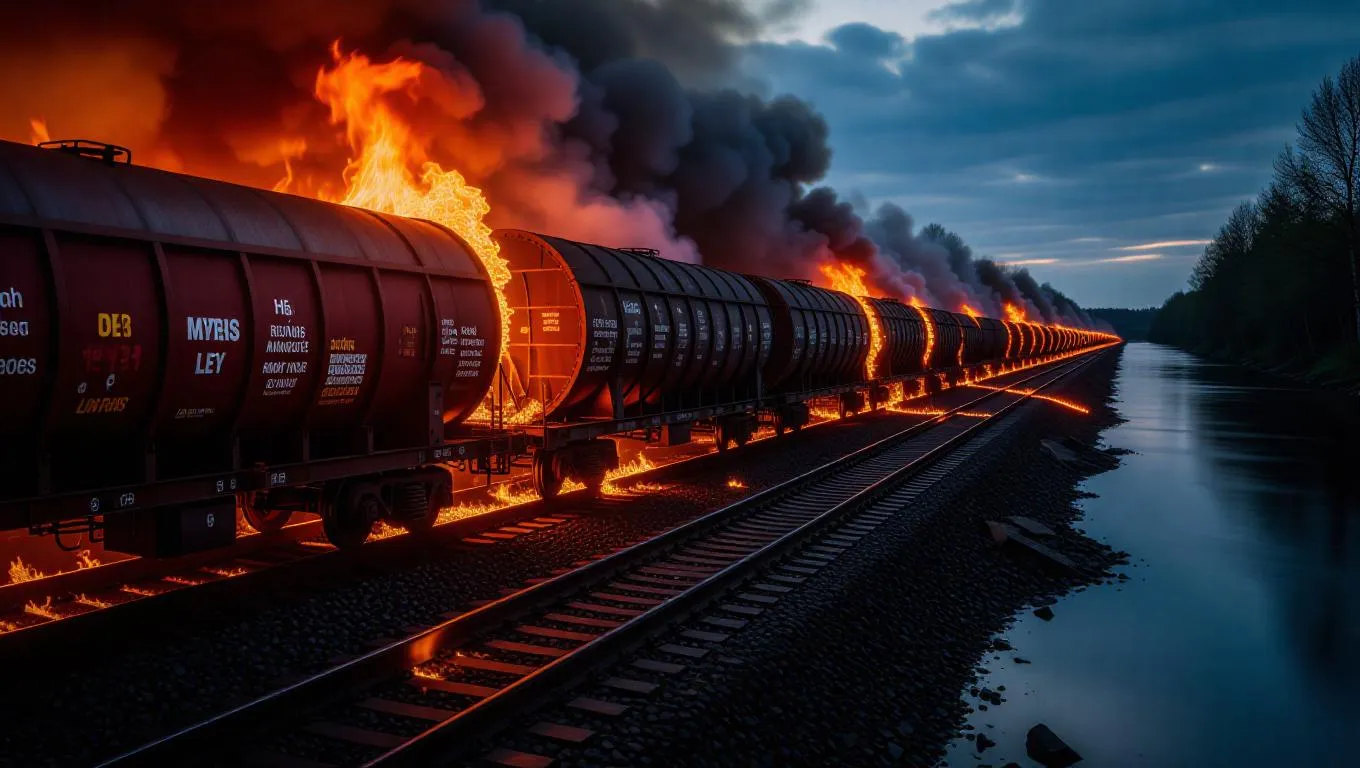 A train derailment has turned a once-bustling railway into a fiery nightmare. The train cars, filled with luggage, are now engulfed in flames. The metal screeches and groans as the fire eats away at them. The tracks themselves are glowing red-hot, as if they are about to detach. The surrounding riverbank is also on fire, with flames spreading rapidly. The dreary sky is illuminated by the intense light of the fire, casting a reflective glow over the scene.