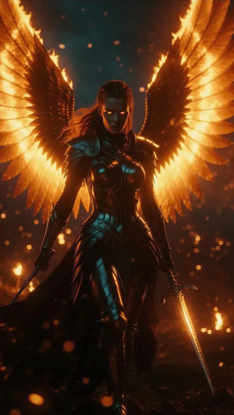 A Valkyrie of fire appearing in the dusk light, her wings made of roaring flames, eyes glowing like molten gold, her spear igniting the battlefield below, epic fantasy, cinematic detail
