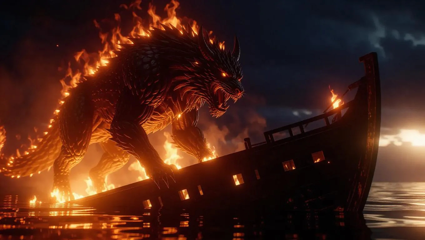 A fire beast prowls through a sunken ship, its body covered in flames, the fire reflecting in its glowing eyes, as it moves with predatory grace, leaving a trail of destruction in its wake