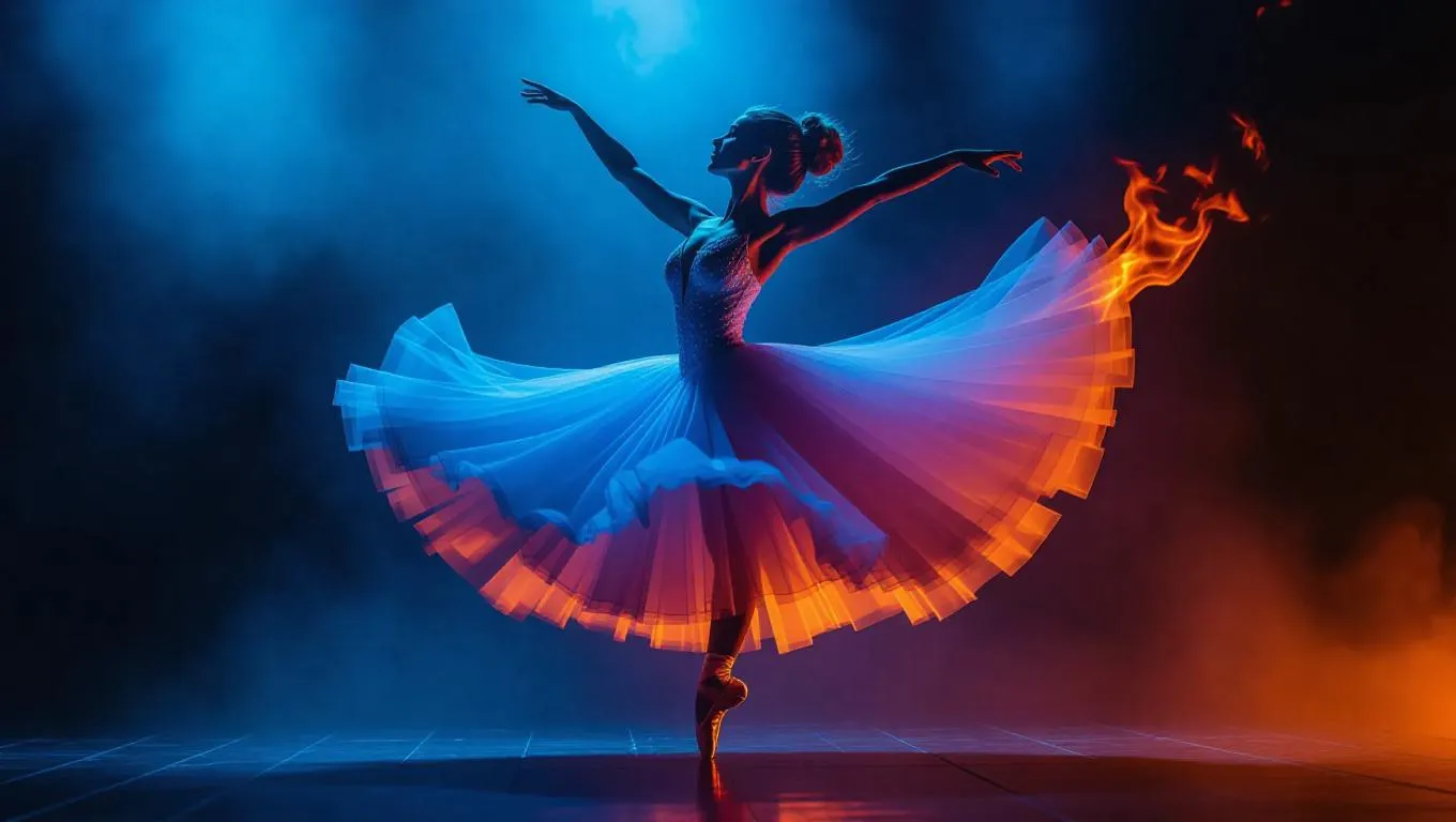 A graceful ballerina spinning on stage, her flowing dress ignited in ethereal blue and orange flames, casting a magical glow across the scene, cinematic lighting, ultra-detailed, fantasy realism