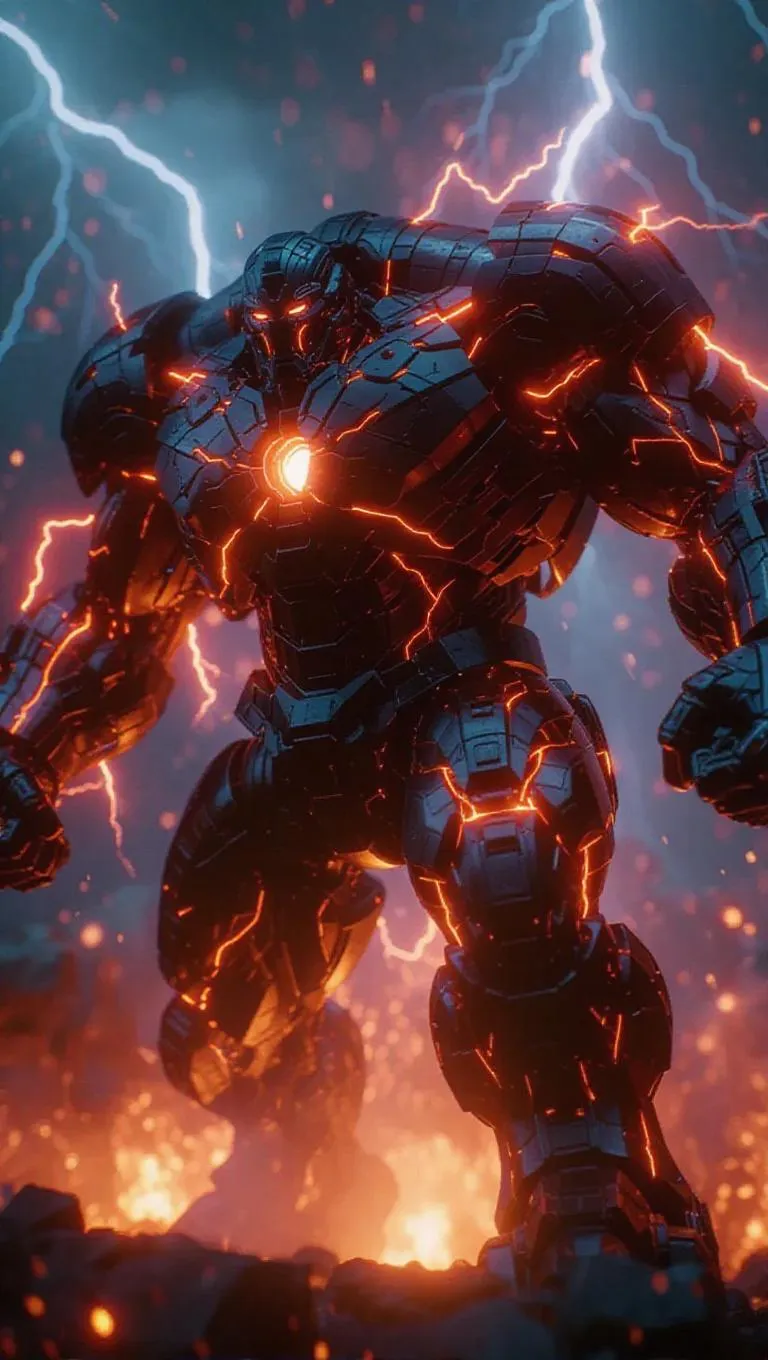 A colossal thunder golem with veins of crackling electricity, every movement releasing explosive bursts of lightning, its eyes glowing like bright thunderstorms, ultra-detailed, cinematic destruction.