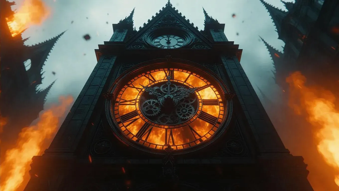A colossal ancient clock tower alone against the silhouette of roaring fire, gears and cogs melting, dystopian aesthetics, dramatic lighting, ultra-detailed.