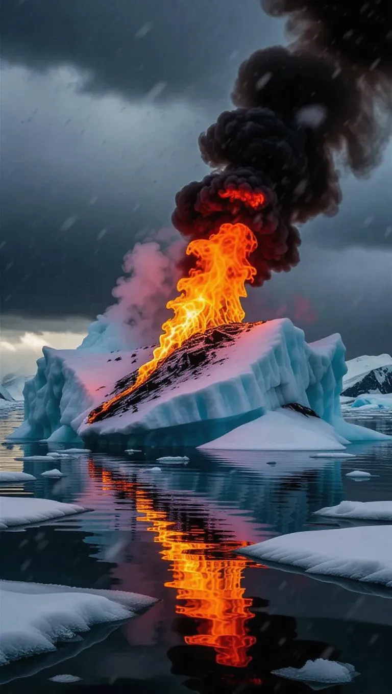 In the middle of the Arctic Ocean, a massive iceberg is on fire. The ice crackles and melts under the intense heat, sending plumes of steam into the air. The fire's glow illuminates the surrounding waters, turning the ice into a surreal, glowing landscape. The iceberg's surface is a mix of molten ice and burning debris, creating a stark contrast between the cold and the heat. The sky above is a dark, stormy gray, with snowflakes falling into the fire, instantly turning to steam. The scene is both beautiful and terrifying, a testament to the destructive power of fire.