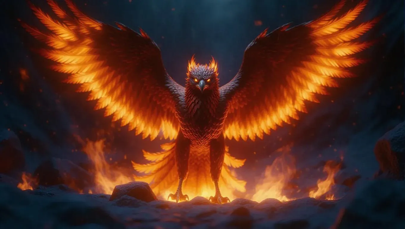 A fierce fire phoenix emerging from icy blue flames, its magnificent wings spreading embers into the atmospheric sky, glowing eyes, highly detailed feathers, fantasy artwork, 4K ultra-HD