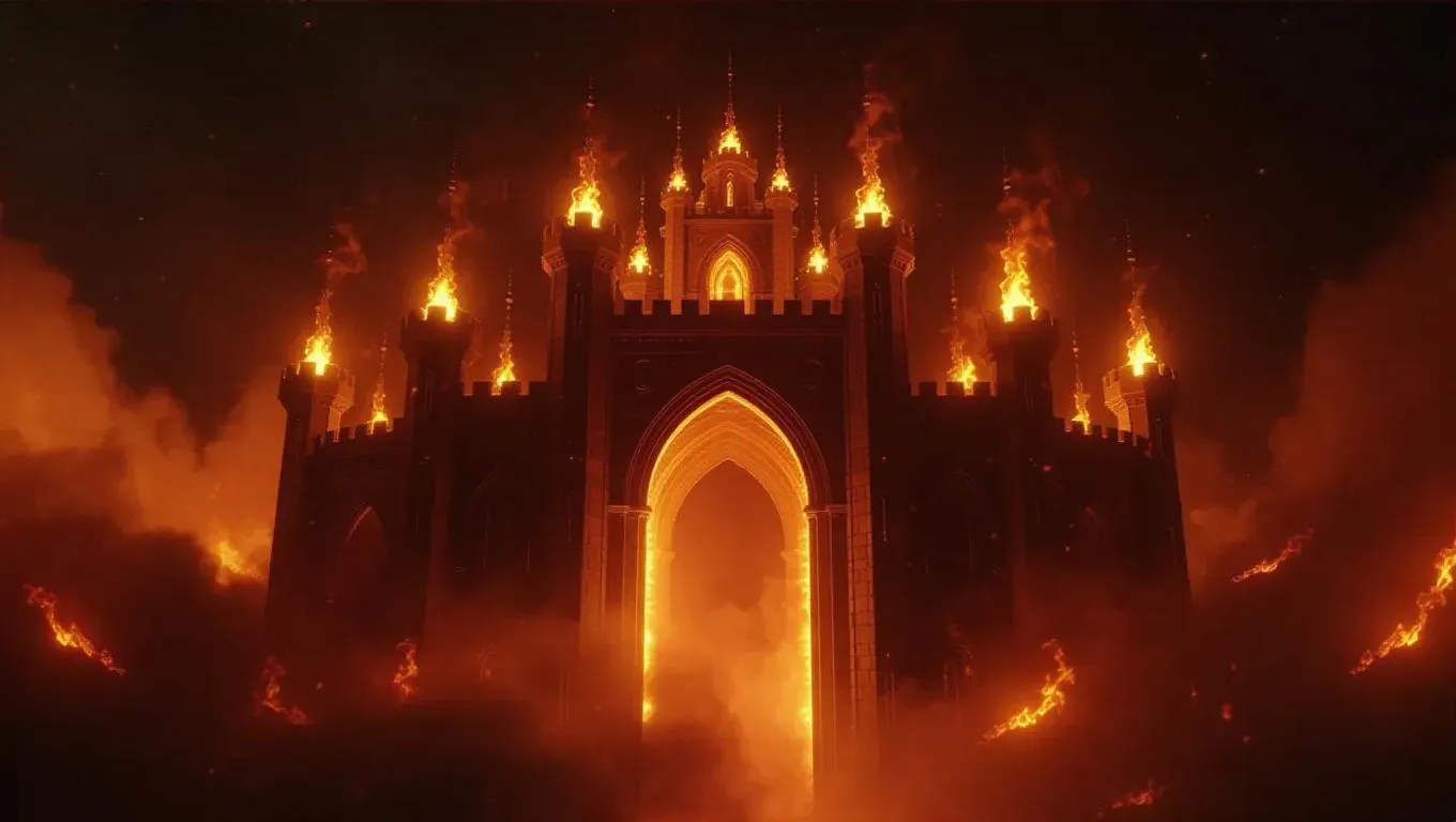 A splendid airborne castle crafted from pure fire, its arches ablaze with colors, floating above a universe of flickering embers, epic fantasy, high detail, ultra-HD