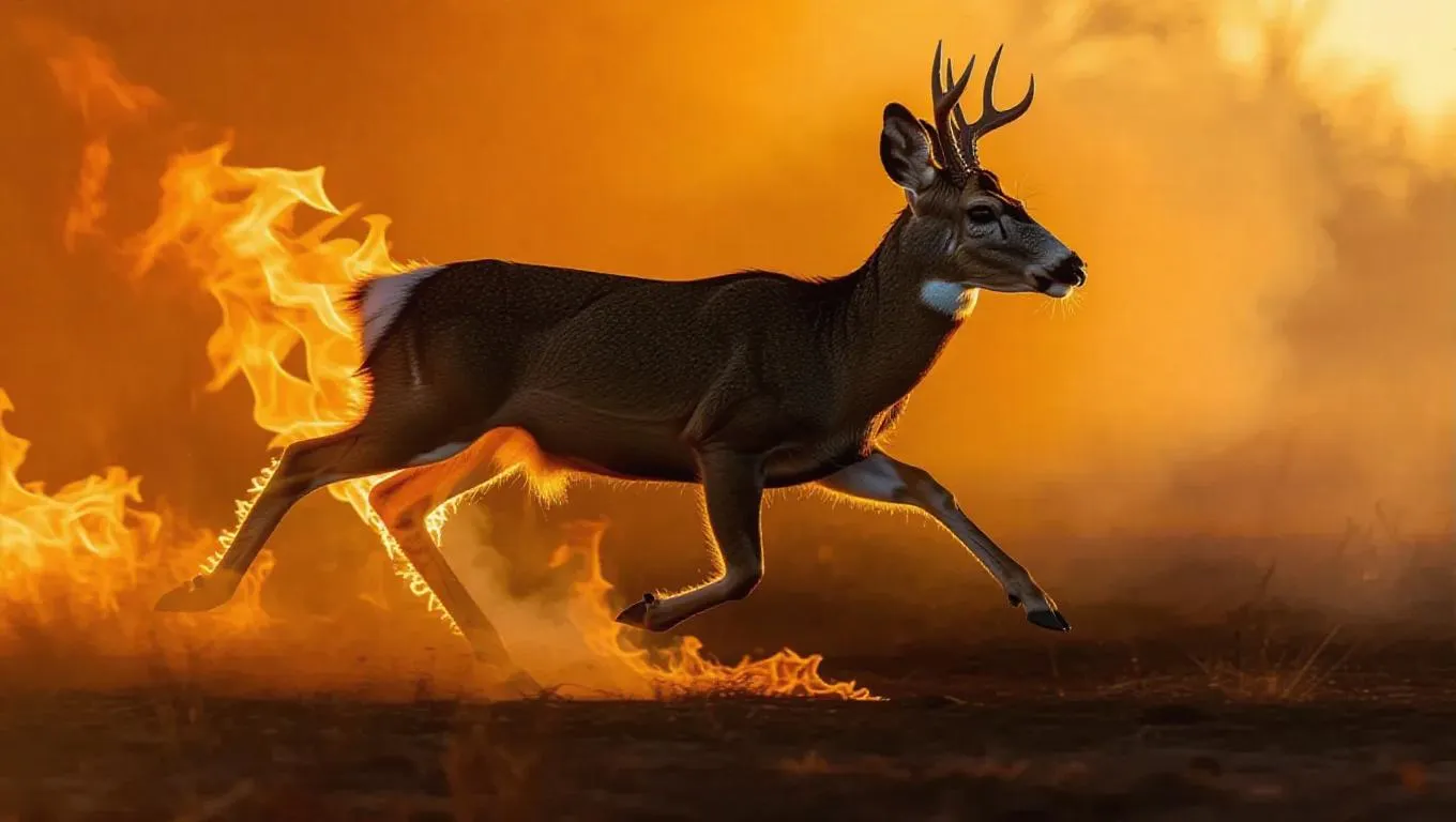 a mule deer sprinting away from a California wildfire, its hindquarters engulfed in licking amber flames. Use a Phantom Flex 4K at 500fps to capture individual hairs igniting and curling upward. Dynamic inferno lighting casts shifting shadows across its contorted face, with fire reflections shimmering in dilated pupils. Billowing smoke filters golden-hour sunlight into a blood-orange haze