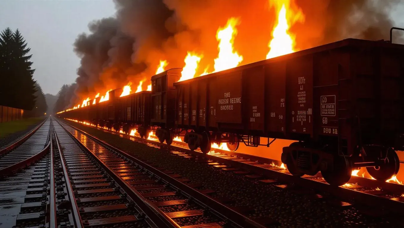 A train derailment has turned a once-bustling railway into a fiery nightmare. The train cars, old and historical, are now engulfed in flames. The metal screeches and groans as the fire engulfs them. The tracks themselves are glowing red-hot, as if they are about to ignite. The surrounding playground is also on fire, with flames spreading rapidly. The rainy sky is illuminated by the intense light of the fire, casting a chaotic glow over the scene.
