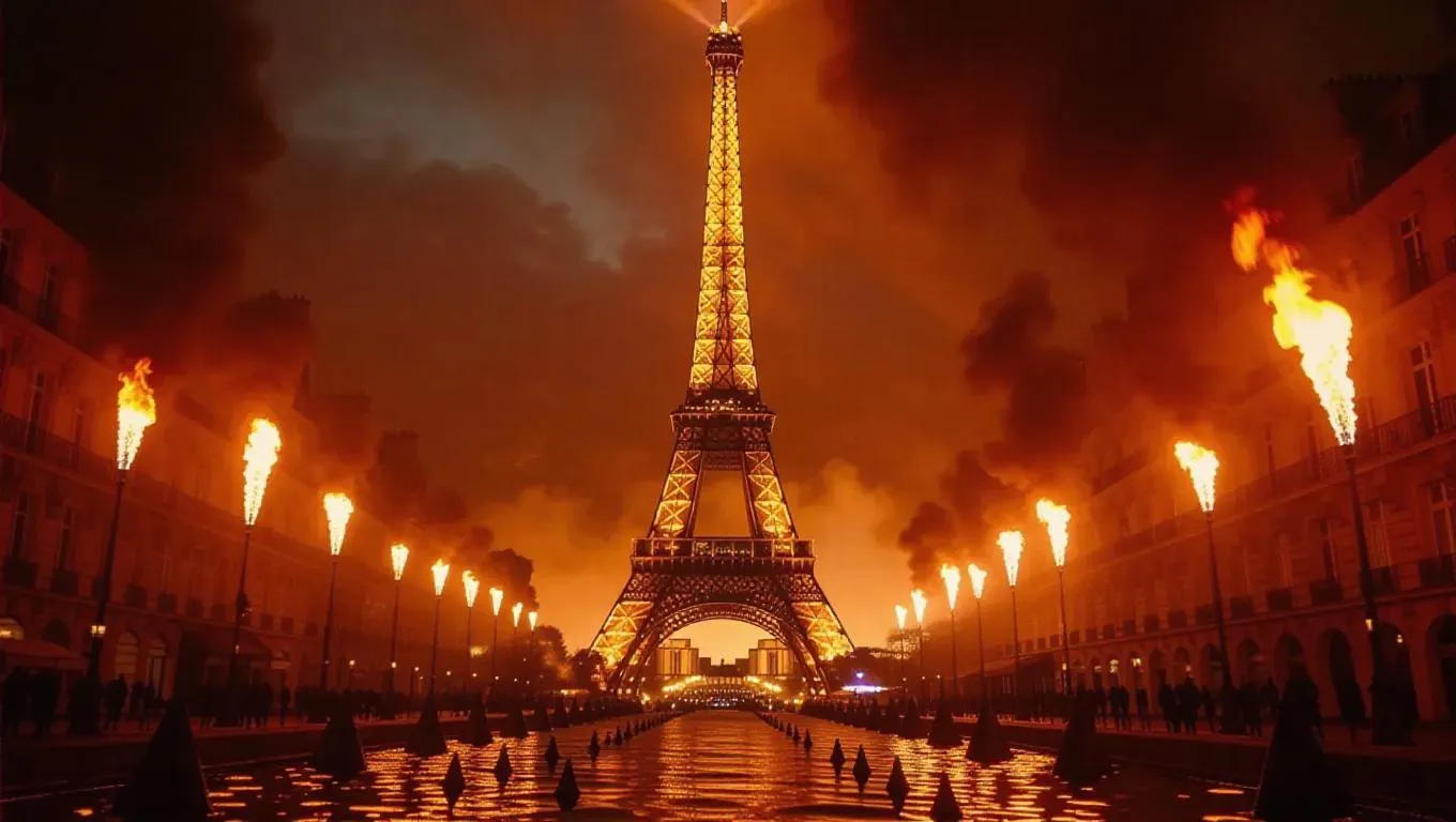 Eiffel Tower transformed into kilometer-tall gas burner, Heavy metal ironwork glowing like industrial machinery. Parisian theaters flooded with liquid fire reflecting dramatic performances.