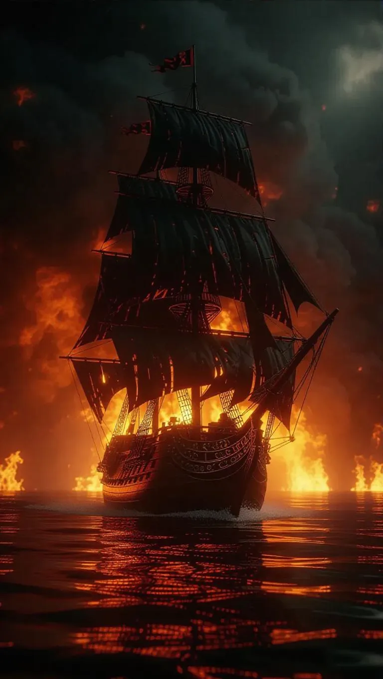 A legendary pirate ship floating in a sea of flames, its shredded sails ignited yet unharmed, dark fantasy piece, hyper-realistic flames.
