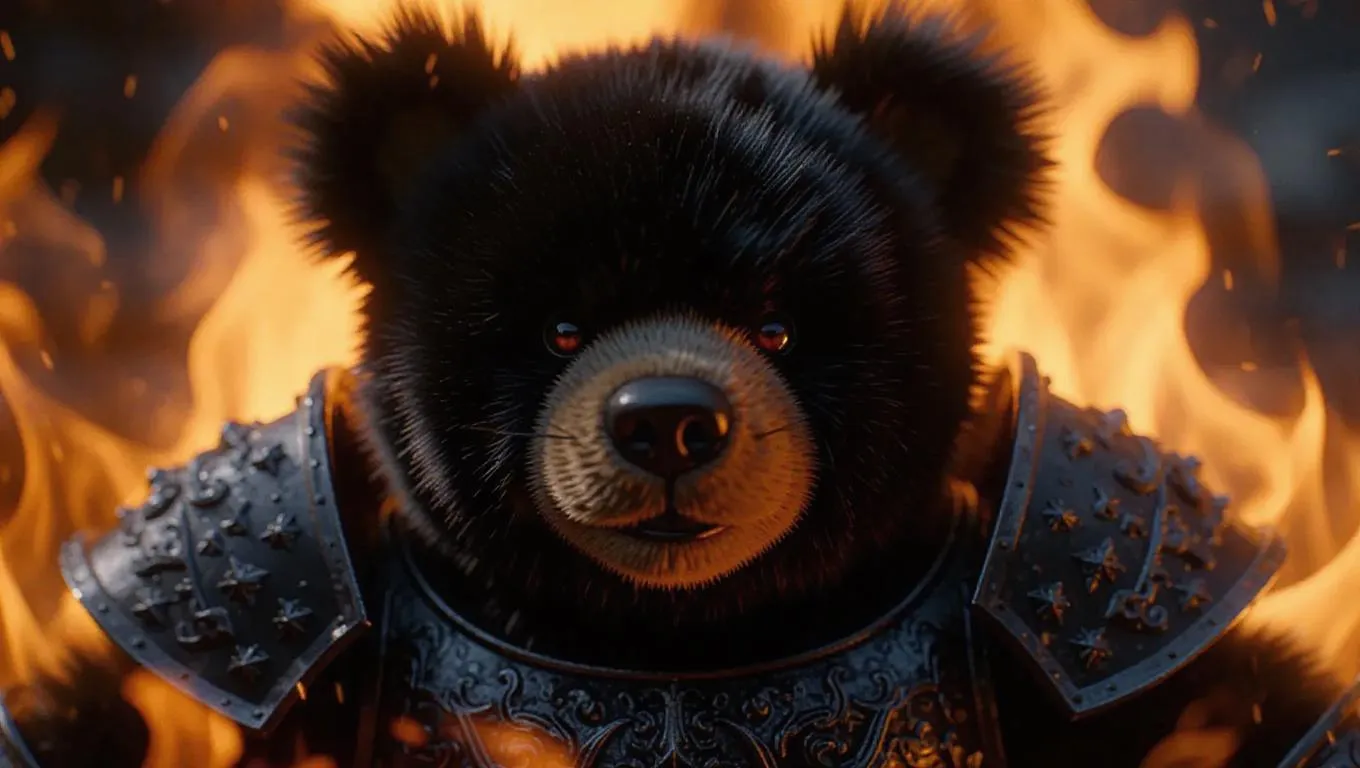 A close-up of a warrior plush bear engulfed in raging amber flames, synthetic fur curling into blackened tendrils.