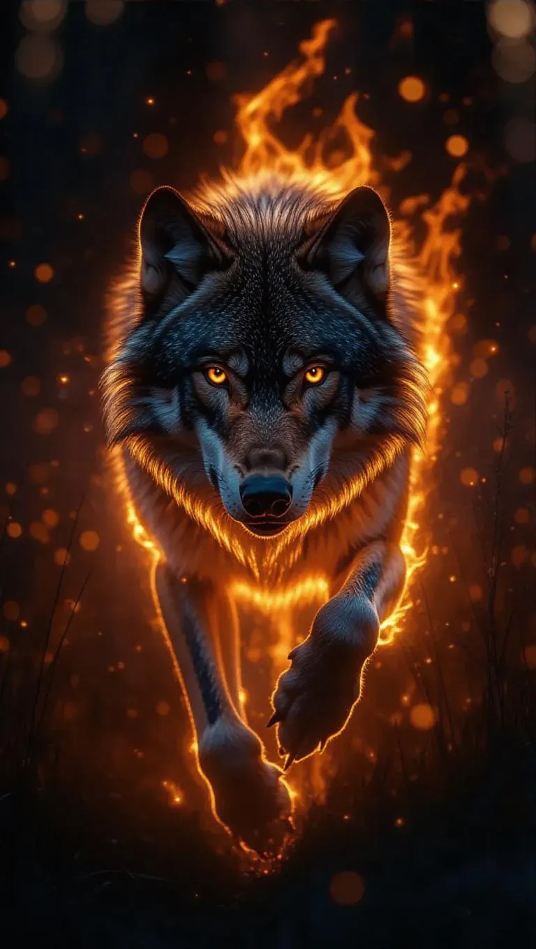A majestic wolf composed entirely of flames, running through a bright enchanted meadow, glowing eyes, sparks trailing its movements, hyper-realistic, cinematic lighting.