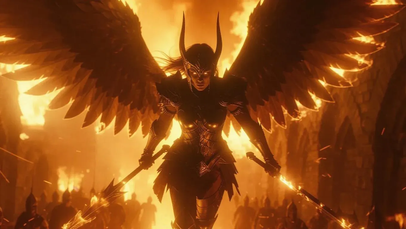A Valkyrie of fire descending from a burning fortress, her wings made of roaring flames, eyes glowing like molten gold, her spear igniting the battlefield below, epic fantasy, cinematic detail