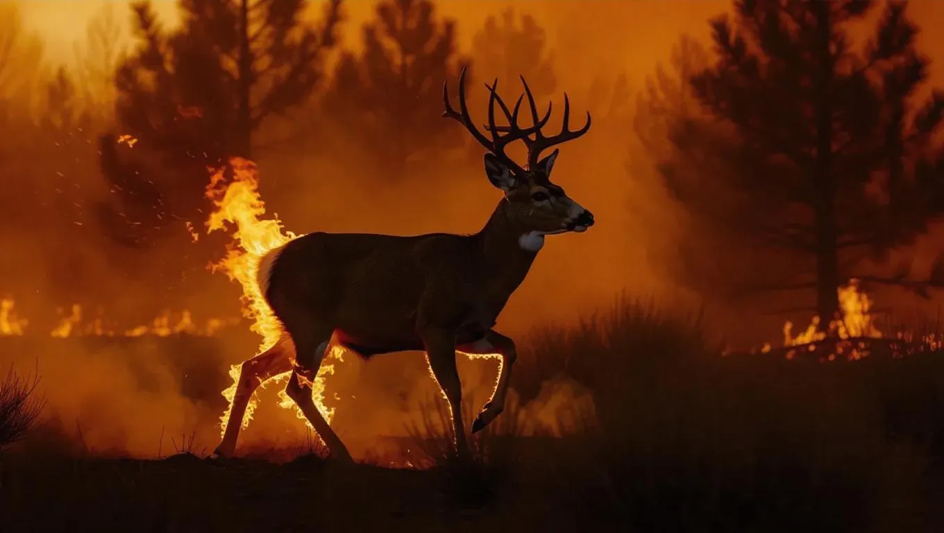 a mule deer fleeing a California wildfire, its hindquarters engulfed in licking amber flames. Use a Phantom Flex 4K at 500fps to capture individual hairs igniting and curling upward. Dynamic inferno lighting casts shifting shadows across its contorted face, with fire reflections shimmering in dilated pupils. Billowing smoke filters golden-hour sunlight into a blood-orange haze