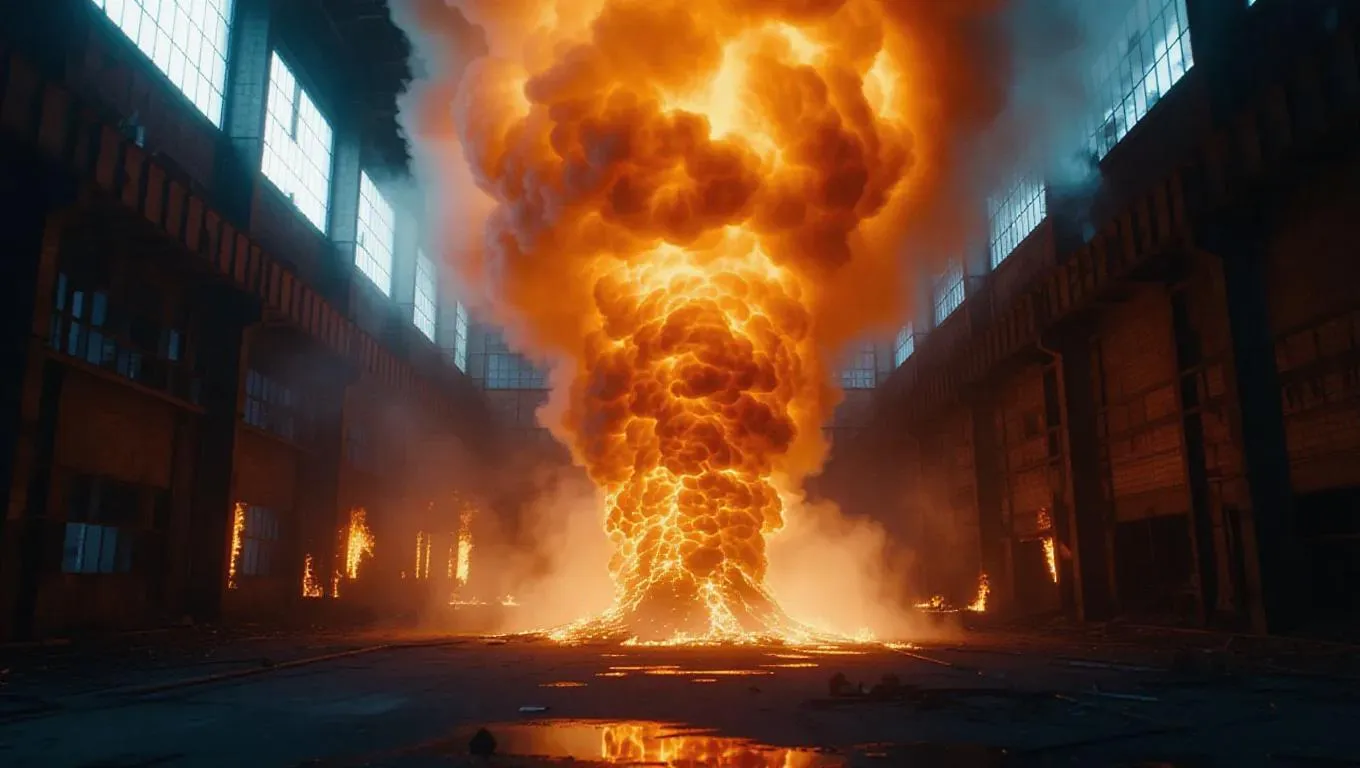 A tremendous fire tornado raging through an abandoned factory, rising embers, stark lighting, industrial collapse, hyper-realistic flames