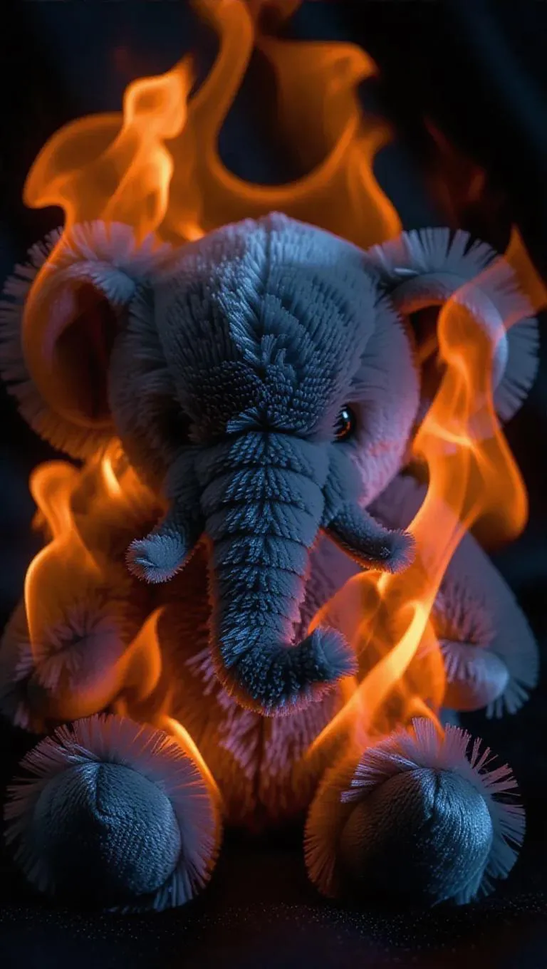 A close-up of a elephant plush bear engulfed in raging amber flames, synthetic fur curling into blackened tendrils.