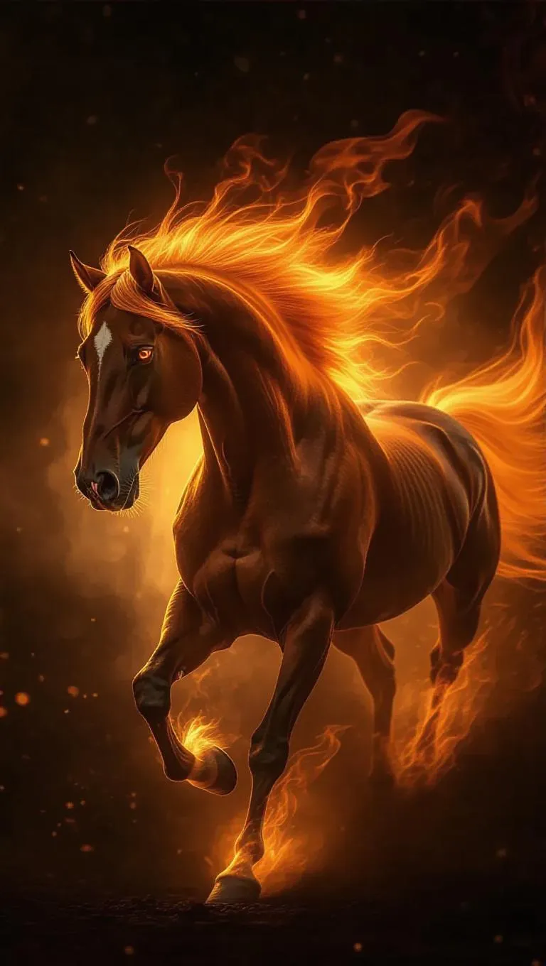 A ethereal fire horse wandering through a mystical realm, its mane and tail blazing with supernatural flames, dramatic fantasy illustration, highly detailed