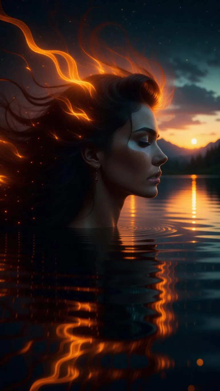 A surreal portrait of a woman with her hair transforming into vibrant flames, the fire flowing like silk in the wind, seamlessly blending with a serene lake reflecting the stars, dreamy and ethereal, ultra-detailed, cinematic lighting, glowing embers.