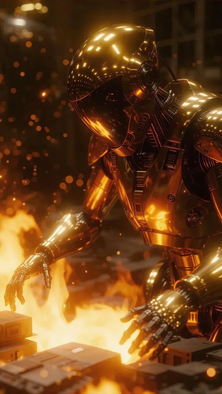 Robotic firefighters with reflective gold skin battling sentient flames in an electronic waste facility, sparks flying over burning devices. Dynamic mecha combat scene, chrome reflections distorted by heatwaves, with a robot engulfed in flames.