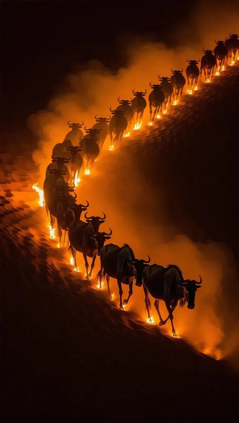 Migrating wildebeest herd aflame across desert, golden fire ripples mimicking sand dunes. Burning hooves leave phosphorescent fungal spores, night vision documentary aesthetic.