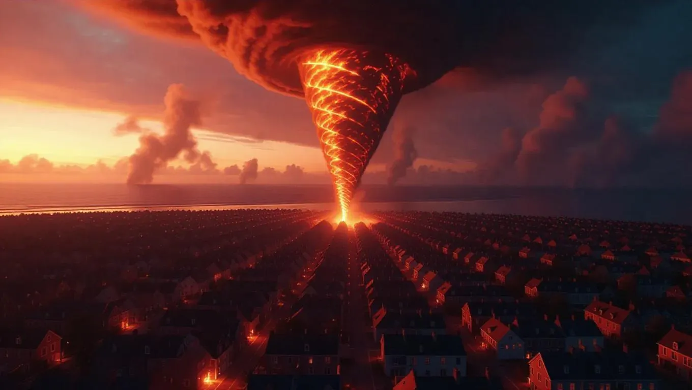 A gigantic fire tornado dominating a coastal town, shimmering embers, soft lighting, colorful destruction, hyper-realistic flames