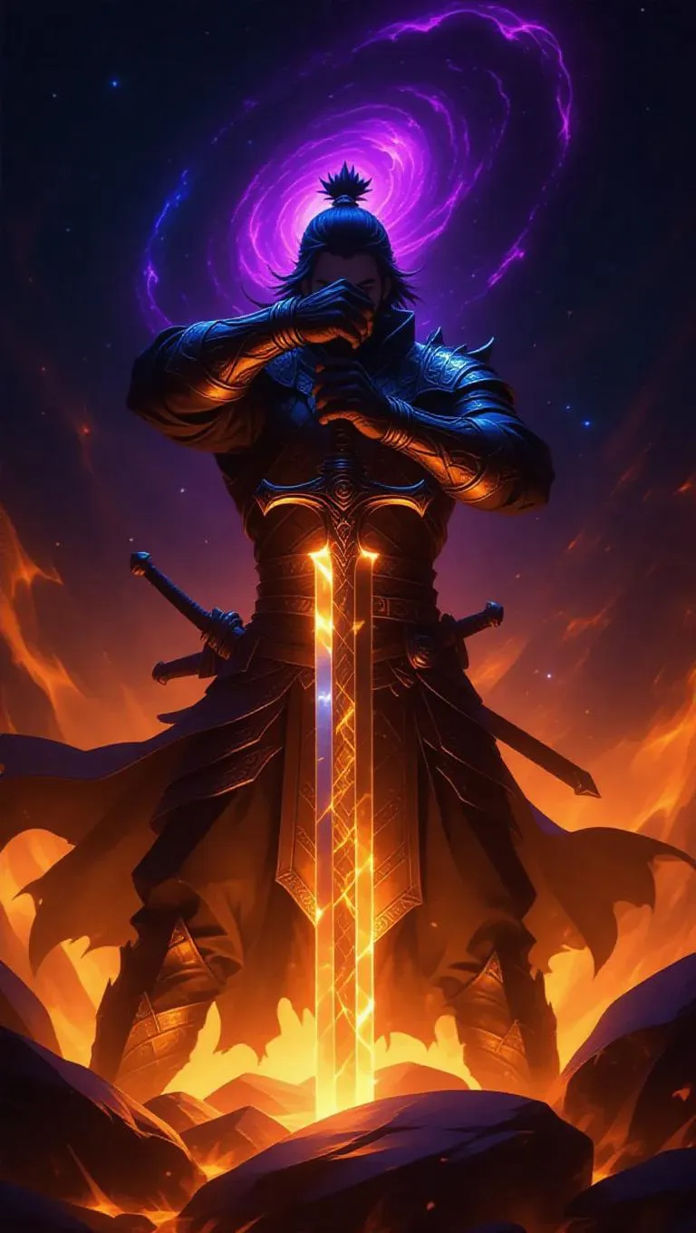 An artisan by a fiery lake, contributing to swords crafted from enchanted crystals in volcanic flames, every strike painting the sky. Ethereal tale, hammer actions flowing with celestial winds in the background, boxed in by dazzling galaxies and cosmic wonders.