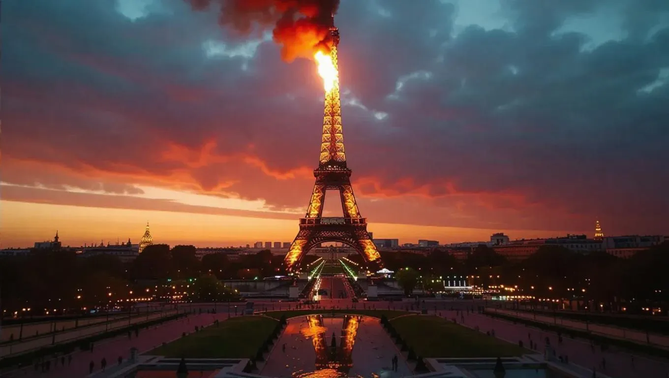 Eiffel Tower transformed into kilometer-tall gas burner, Industrial ironwork glowing like molten metal. Parisian markets flooded with liquid fire reflecting bustling activity.