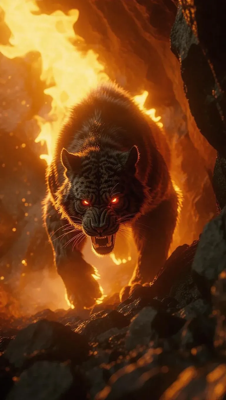 A fire beast prowls through a rocky cliff, its body covered in flames, the fire reflecting in its glowing eyes, as it moves with predatory grace, leaving a trail of destruction in its wake