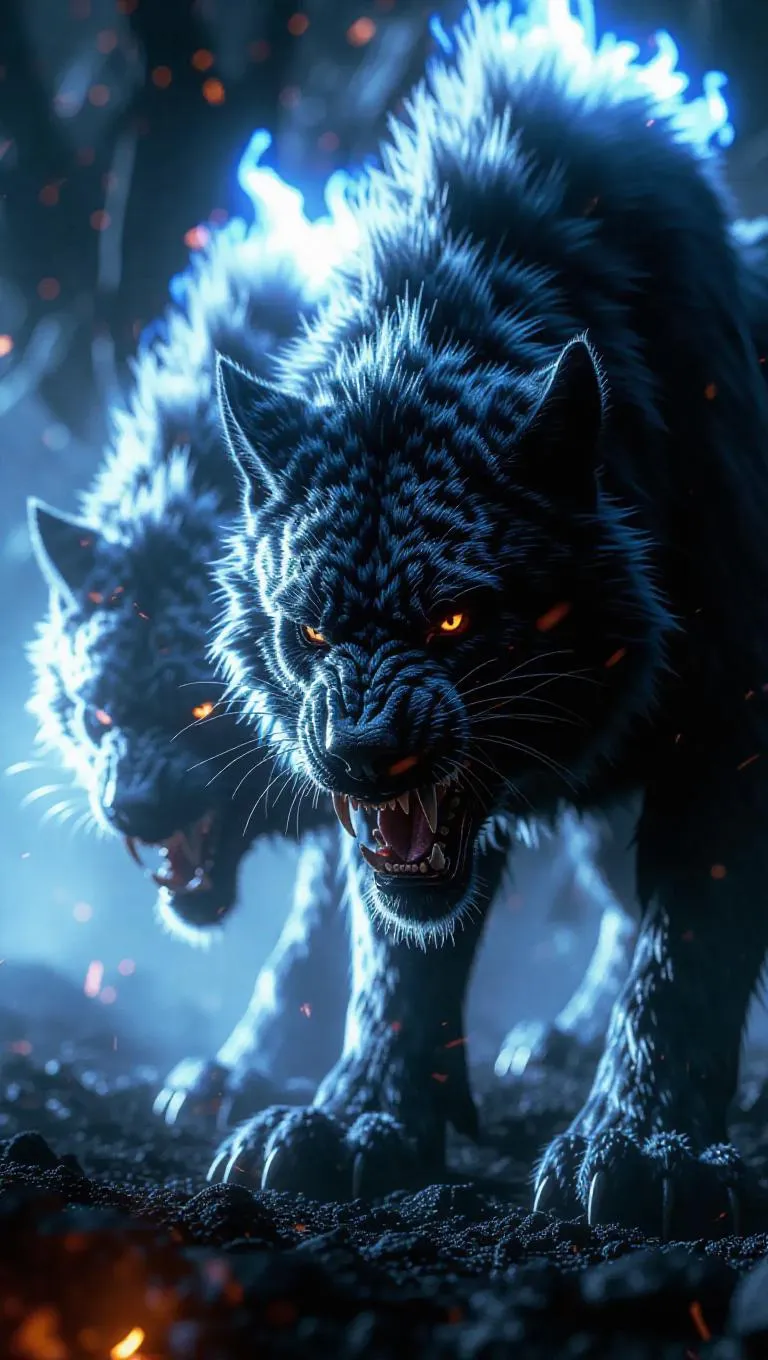 A monstrous three-headed Cerberus with fur made of raging flames, each head spewing fire as it prowls the shadowy depths of the underworld, intense lighting, hyper-realistic textures