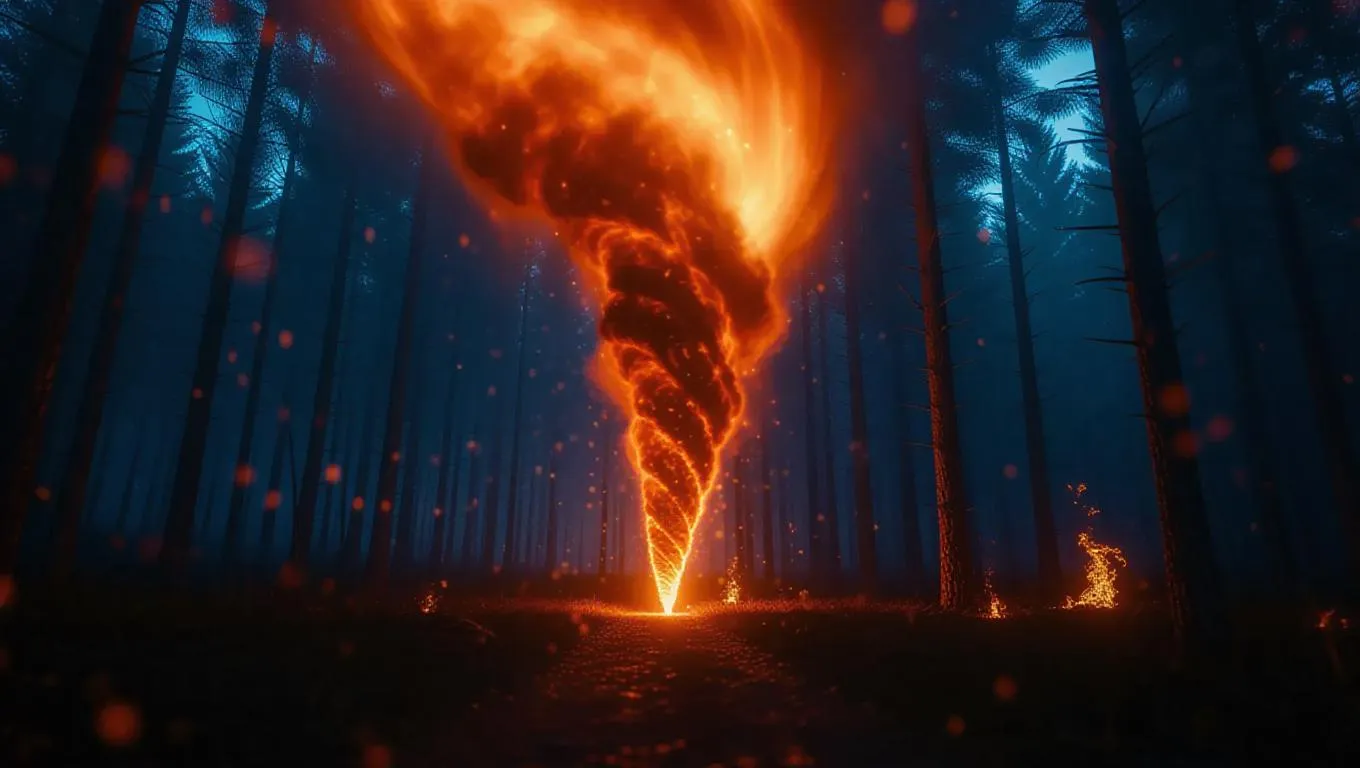 A gigantic fire tornado barreling through a haunted forest, swirling embers, spooky lighting, supernatural havoc, hyper-realistic flames