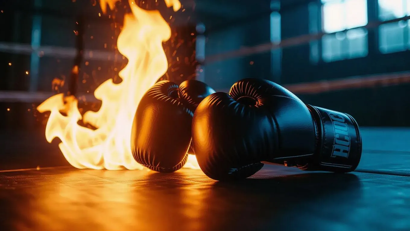 A pair of new boxing gloves suddenly catches fire during a first-time fighter's training session in a modern gym, the flames spreading across the leather, the scene illuminated by the glow of the burning gloves.