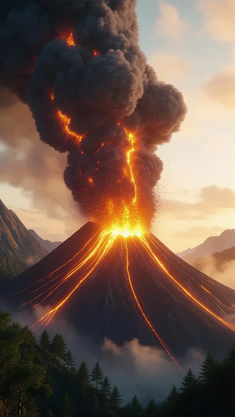 A vibrant volcano erupting excitedly, hurling liquid fire into the sky, entire forests engulfed in unstoppable flames, hyper-realistic, extreme detail.
