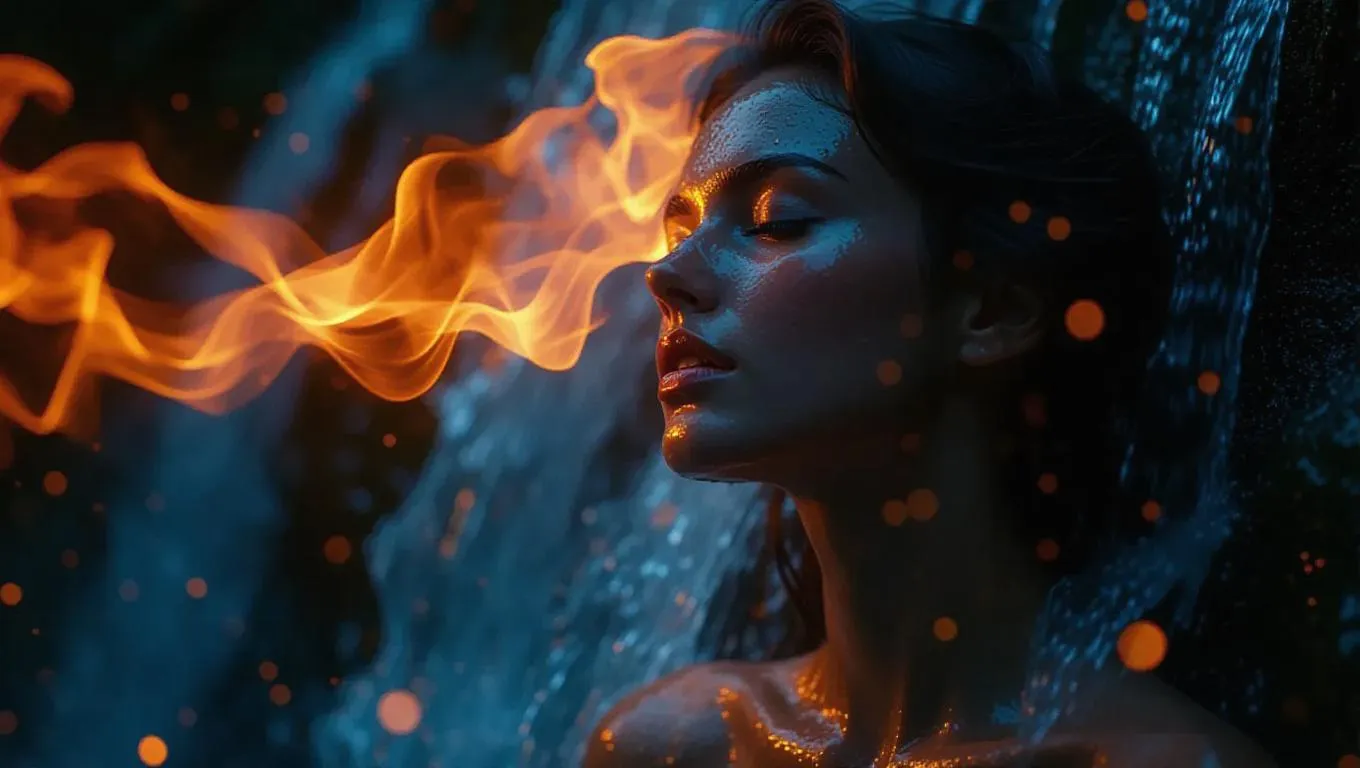 A surreal portrait of a woman with her hair transforming into vibrant flames, the fire flowing like silk in the wind, seamlessly blending with a waterfall under moonlight, dreamy and ethereal, ultra-detailed, cinematic lighting, glowing embers.