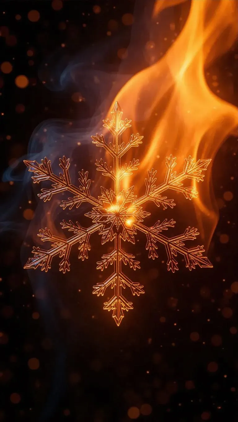 A close-up of an intricate snowflake engulfed in fierce flames, its shape blazing with fiery intensity, casting an enchanting glow, with smoke curling around the edges, creating a dramatic and surreal atmosphere.