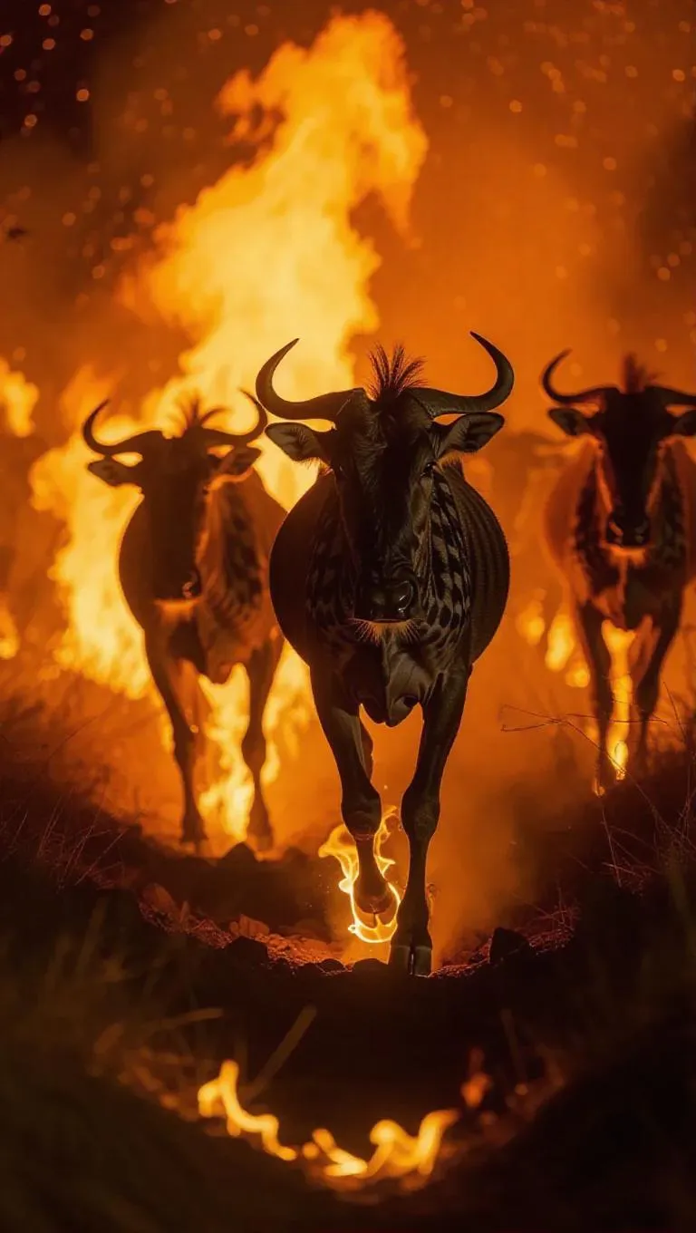 Migrating wildebeest herd aflame over rocky terrain, golden fire ripples mimicking grass waves. Burning hooves leave phosphorescent fungal spores, night vision documentary aesthetic.