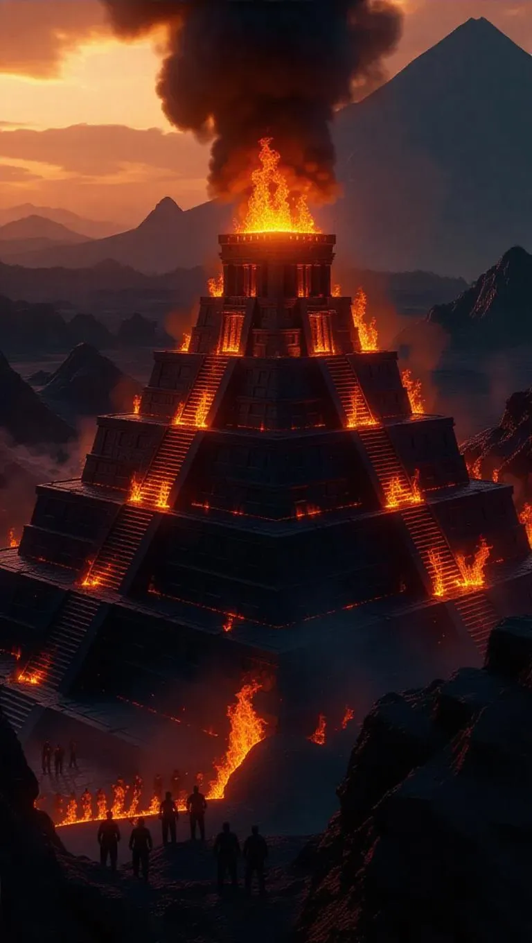 AI archaeologists reconstructing Atlantis using volcanic ash frameworks, each eruption portraying the city's story in blazing fire. Lidar-analyzed ruins fused with cosmic art flames.