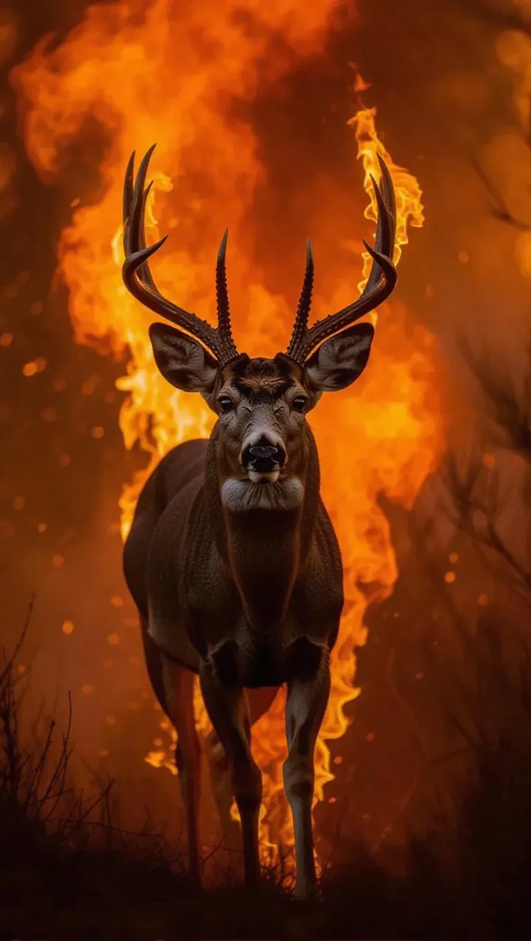 a mule deer escaping a fierce California wildfire, its hindquarters engulfed in licking amber flames. Use a Phantom Flex 4K at 500fps to capture individual hairs igniting and curling upward. Dynamic inferno lighting casts shifting shadows across its contorted face, with fire reflections shimmering in dilated pupils. Billowing smoke filters golden-hour sunlight into a blood-orange haze