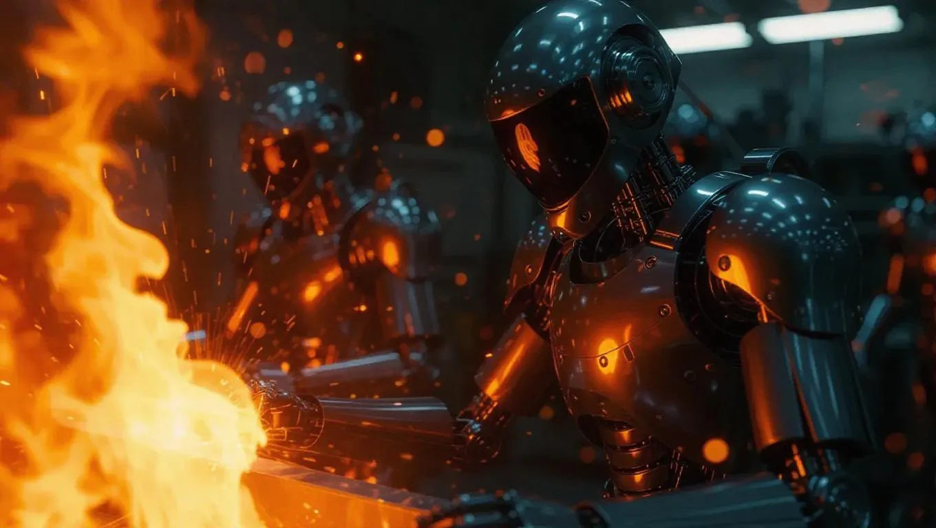 Robotic firefighters with pearlescent skin battling sentient flames in a laboratory, sparks flying over burning experiments. Dynamic mecha combat scene, chrome reflections distorted by heatwaves, with a robot engulfed in flames.