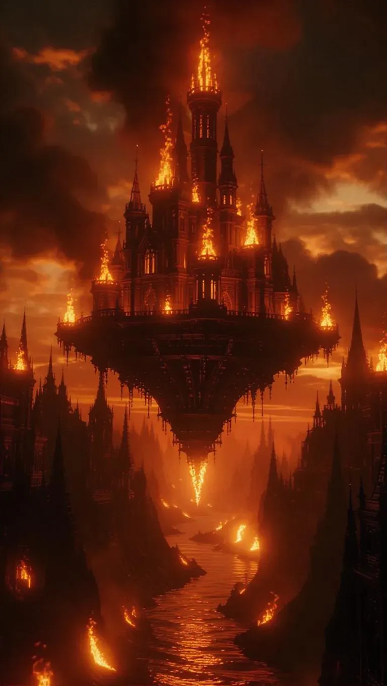 A titanic floating enclave of flames, its architecture a dance of fire, elevated above a wasteland of burning memories, epic fantasy, high detail, ultra-HD
