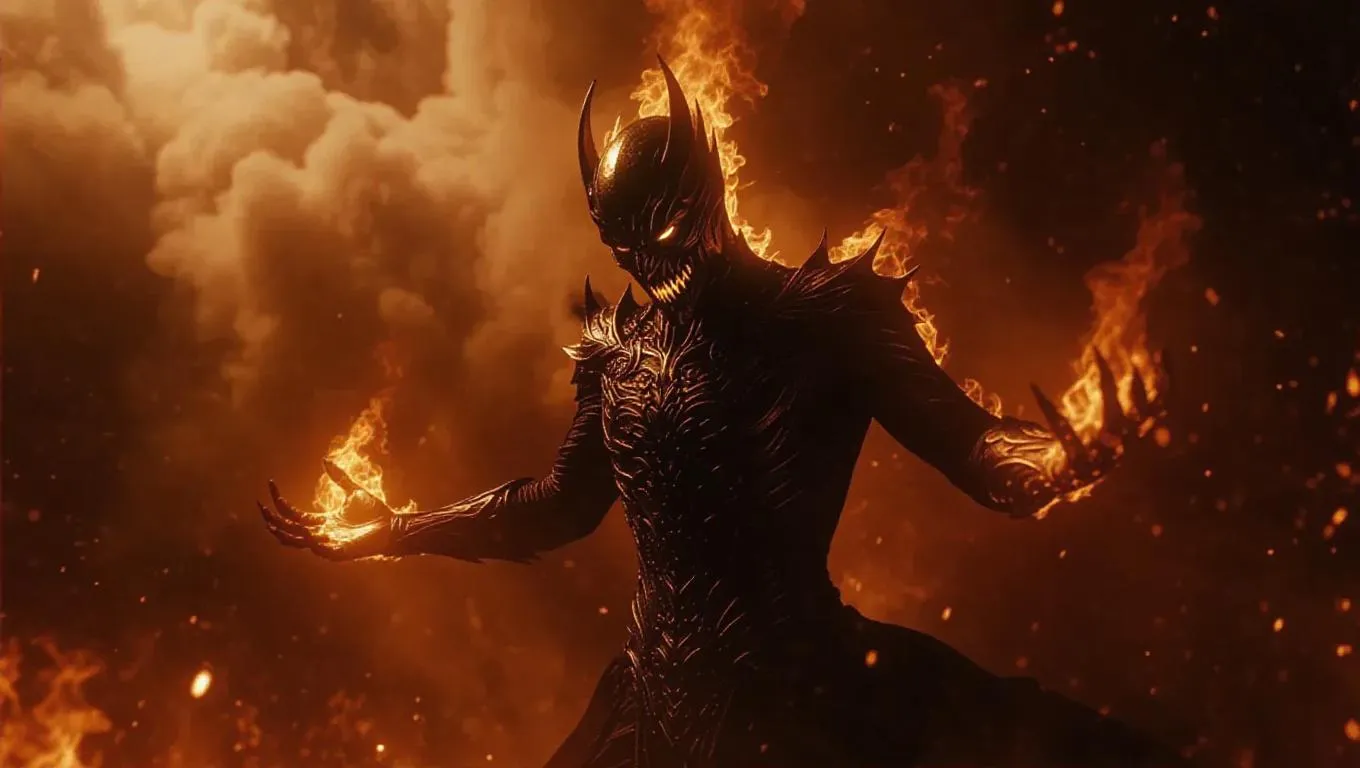 A vengeful fire specter, his shape alive with crackling flames, overseeing a mass of incinerated offerings, fire dancing among the clouds, ultra-detailed, dark fantasy