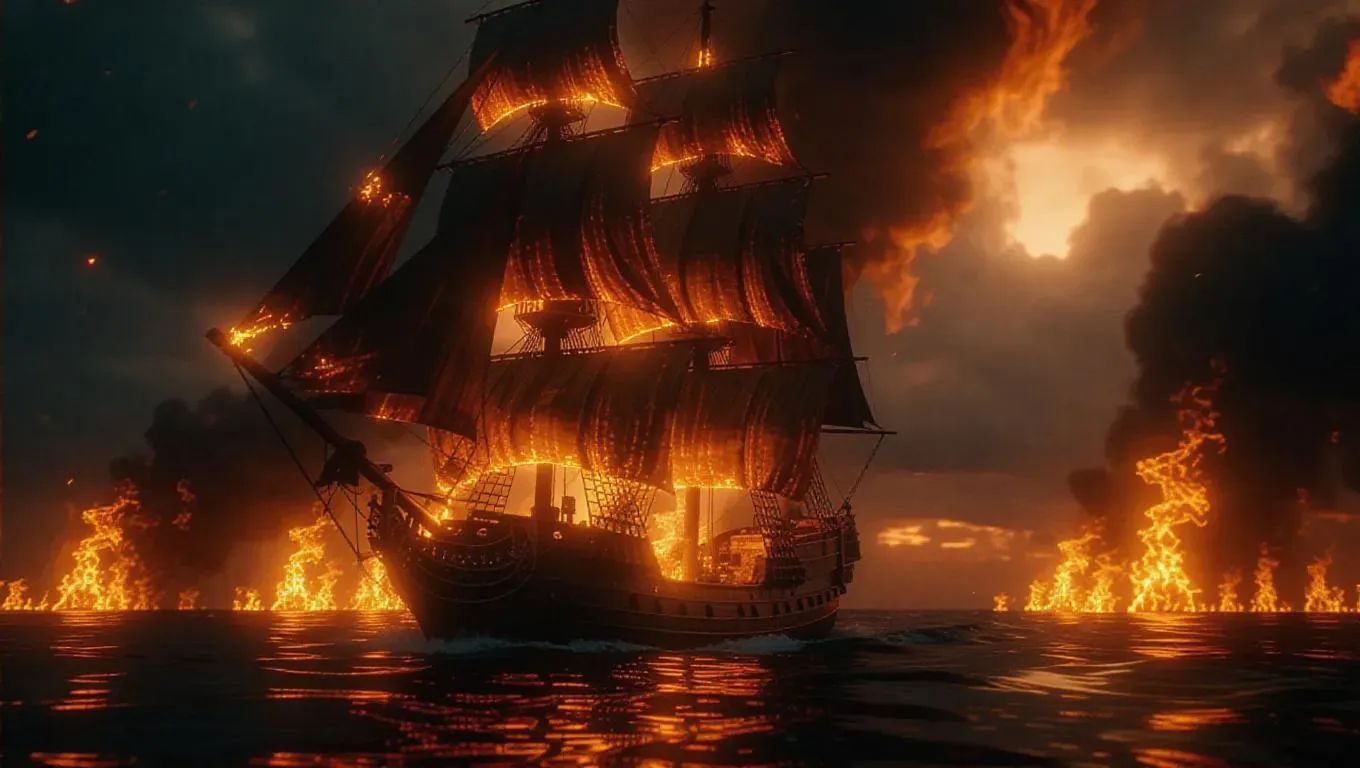 A rusty pirate schooner traversing flames across the sea, its tattered sails shining with fire yet resilient, dark fantasy portrayal, hyper-realistic flames.