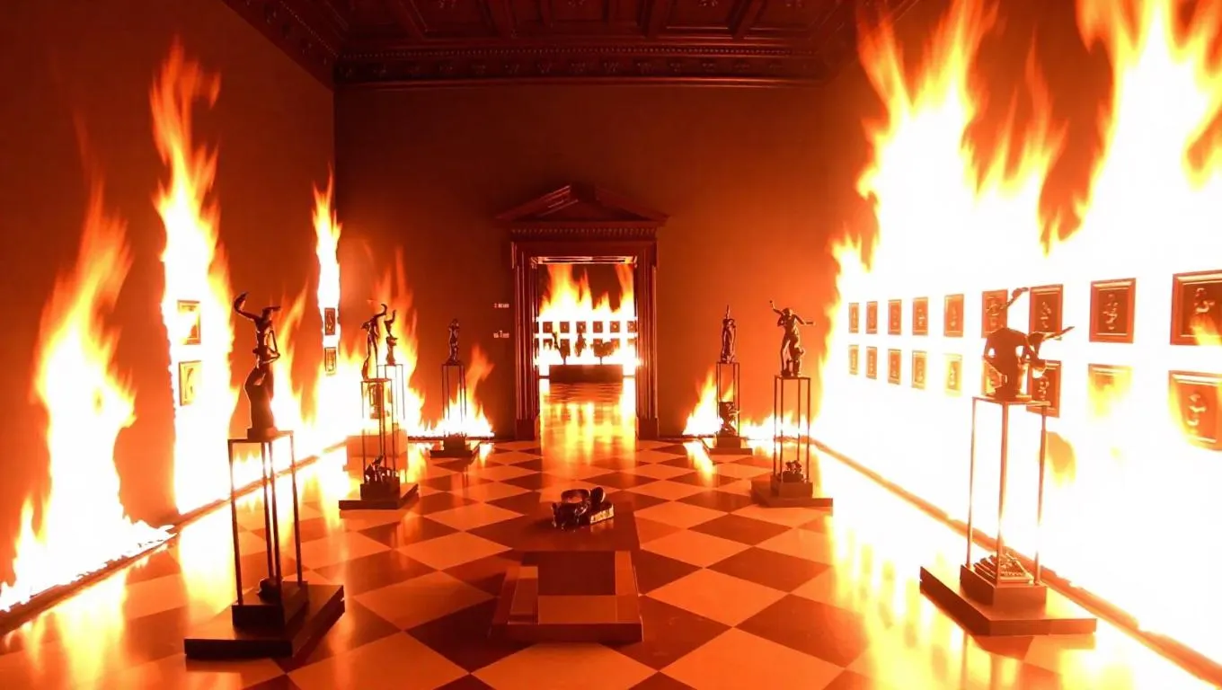 An art gallery, once a sanctuary for priceless masterpieces, is now a raging inferno. The walls, once adorned with intricate sculptures, are now a charred, blackened husk. Flames leap from sculpture to sculpture, consuming the marble and bronze with voracious intensity. The marble floors are cracked and glowing red-hot, as if the very foundation of the gallery is being devoured by the fire. The air is thick with the acrid smell of burning metal and stone, making it nearly impossible to breathe.