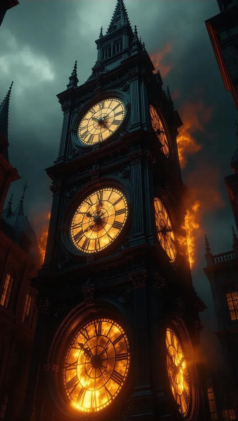 A colossal ancient clock tower decorated with roaring fire, gears and cogs melting, surreal aesthetics, dramatic lighting, ultra-detailed.