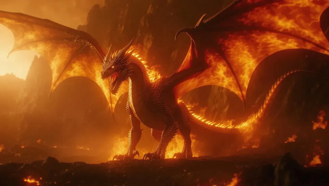 An enormous fire dragon with blazing wings, its roar echoing through a fiery landscape, the air thick with smoke, ultra-detailed, cinematic epic fantasy